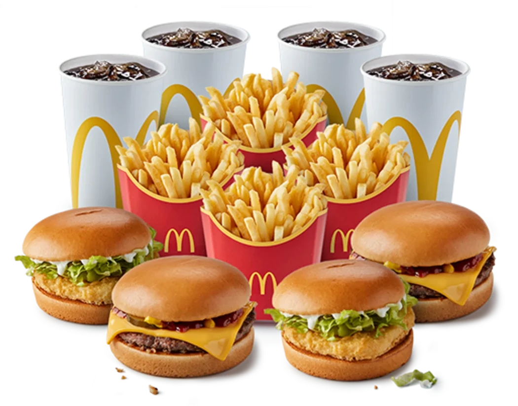 Four selected Burgers (Cheeseburger or Mayo Chicken, four Medium Fries, four Medium Cold Drinks. Allergen info: mcdonalds.co.uk/nutrition